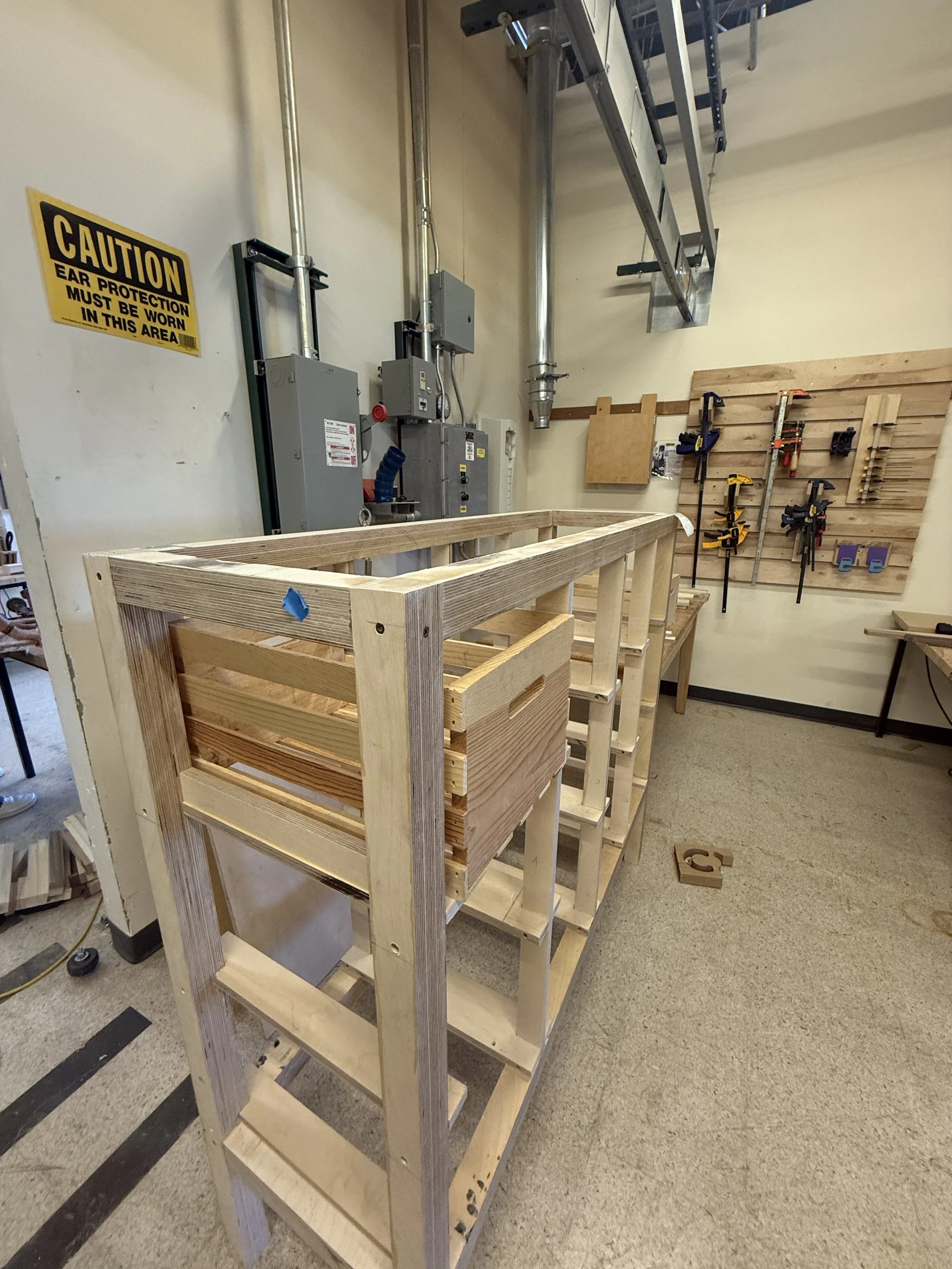 Measured and cut all components for the shelf redesign using recycled plywood.